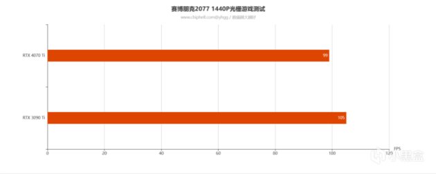 赛博朋克 2077 游戏中,RTX 4070Ti 平均帧率 99 FPS,RTX 3090Ti 105 FPS,3090Ti 略高于 4070Ti 6 帧。