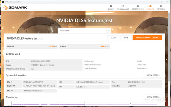 NVIDIA DLSS功能测试,新款 3DMARK 已经支持 NVIDIA DLSS 3.0,DLSS 关闭 29.44 FPS,DLSS 开启 129.3 FPS。DLSS 3 由 GeForce RTX 40 系列 GPU 所搭载的全新第四代Tensor Core 和光流加速器提供支持,相比 DLSS 2 增加了帧生成技术,能够预测中的运动,在保持图像质量的同时实现更高的帧率。
