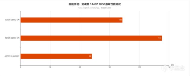 瘟疫传说:安魂曲游戏中,RTX 4070Ti 开启 DLSS 3 平均帧率 143 FPS,关闭 DLSS 3 72 FPS;RTX 3090Ti 开启 DLSS 2 平均帧率 103 FPS。开启 DLSS 3 的 RTX 4070Ti 领先 RTX 3090Ti 多达 40 帧。
