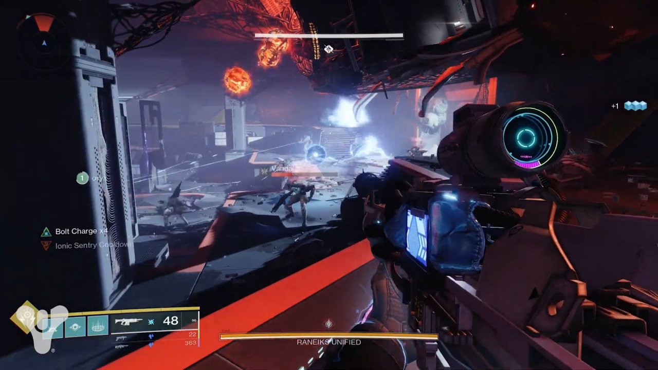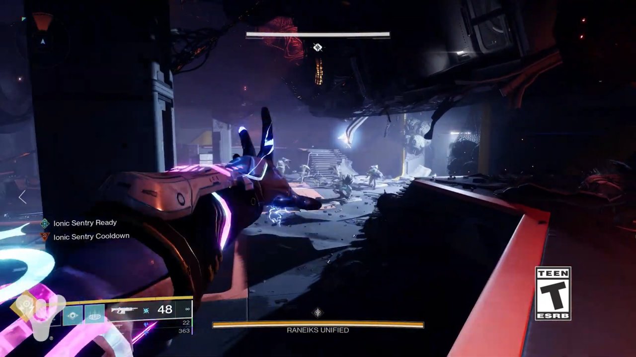 使用电弧技能或武器击杀目标将会为离子哨兵充能。激活手雷: 放置1个强大的电弧炮台,直击时可(电弧)致盲敌人,并向周围的敌人发射连锁闪电,击杀敌人时给予电球充能