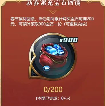 活动期间,宝石福利大放送!累计购买宝石每满 200 元,即可额外领取 900 宝石一份,此福利可重复获取。积攒宝石,静待商城下一款有缘的精美皮肤吧!