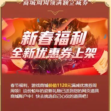 活动期间,游戏网页商城为您准备了满减优惠券,每周都能领取!这份蛇年新春的贴心礼物已经悄然送达您的网页道具商城账户,快去挑选那些令您心仪已久的道具吧!