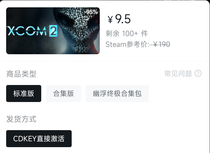 《幽浮2》本体9.5元。合集版价格26.16元(包含幽浮2+DLC)。幽浮终极合集包价格65.65元(包含三部幽浮游戏及全DLC)