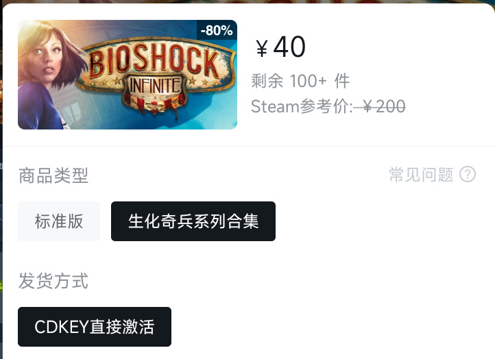 《生化奇兵》系列合集40元,没有必要拆开买,要买直接买大包,毕竟这是第九艺术!个人认为此生必玩的系列!