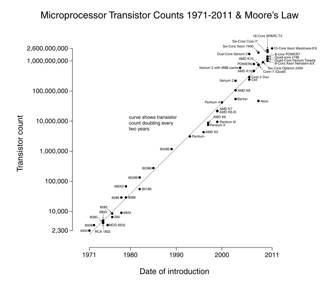 到了 1975 年摩爾在國際電信聯盟 IEEE 的學術年會上提交了一篇論文,摩爾依據市場的實際發展狀況,對之前的預測進行了修正,將元件數量翻倍的週期調整爲每兩年一次 。這一經過完善的理論,被人們稱作 “摩爾定律”。