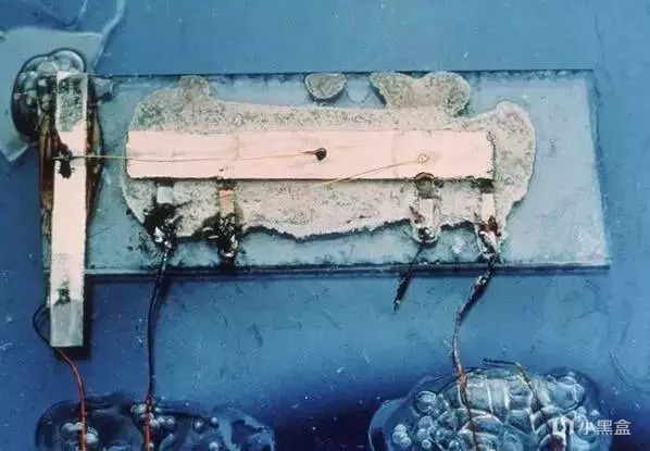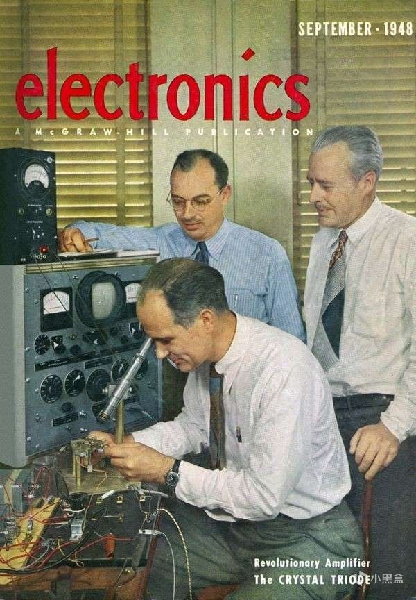 肖克利的兩位同事,約翰・巴丁和沃爾特・布拉頓,基於肖克利此前通過三極管和 PN 結提出的半導體放大信號功能的場效應設想展開研究。1947 年,他們僅用幾條金箔片、一片半導體材料和一個彎支架,製成了一個能實現電流傳導、放大和開關功能的小模型,並將其命名爲點接晶體管放大器 。