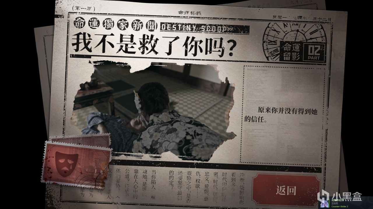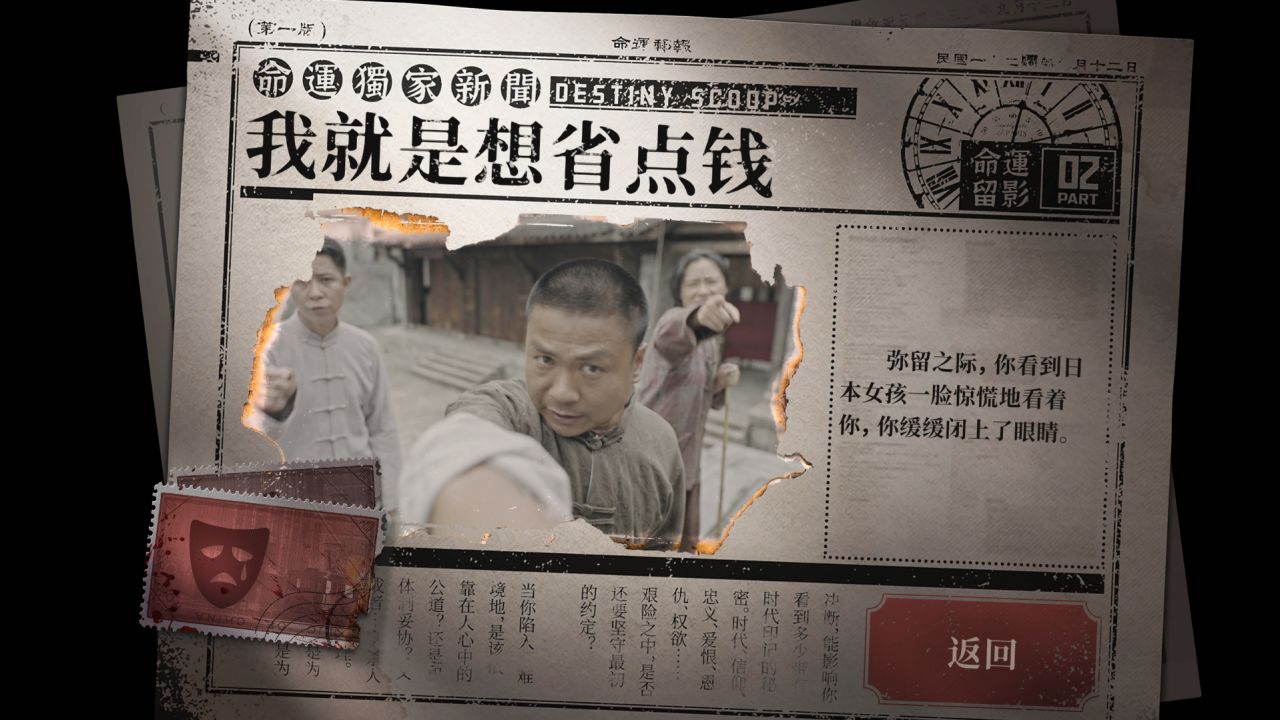 第二章:强抢民女(不选走为上策)—和服女子(不选领一份,不要白不要)—教育小孩(不选劝她别当圣母)—接下来去哪(选择陪欣凡卖书)—危在旦夕(不选择直接拔枪)—又见卖花的小姑娘(选择没钱,莫挨老子)—方小姐的消息(选择改变历史)