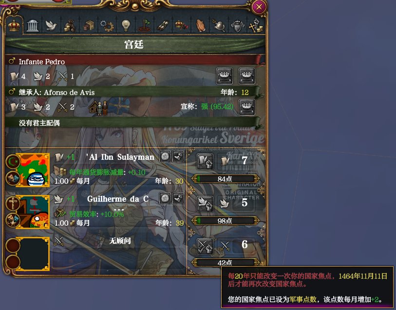 選擇顧問上,這把運氣非常好,有顧問“鑄幣專家”和“商人”,開局就可以嘗試刷200點數。因爲葡萄牙資金問題,這裏選不僱軍事顧問,省點錢。(不過前期的仗還是要打,就國家焦點了軍事)