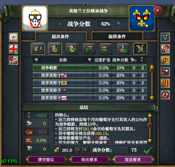 話說回來,由於卡卡的幫助輕鬆圍下巴黎後,讓法雞放棄英格蘭核心,喫一塊核心,戰爭賠款加上部分錢。(這裏也是失誤了,應該自己喫下然後放附庸,後續再打法蘭西可以繼續收核,不過也是算了)