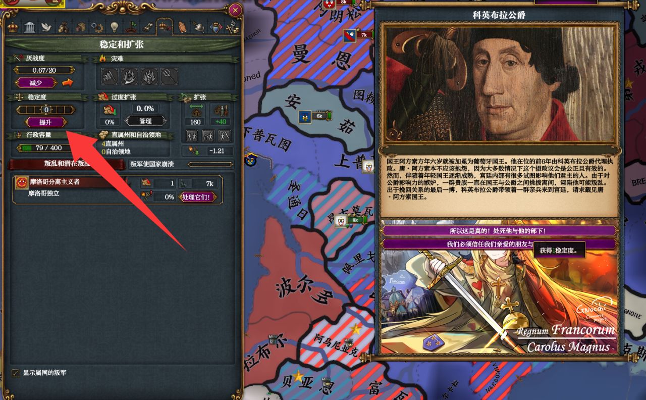 途中觸發了葡萄牙的專屬事件“科英布拉公爵”,先手動提上正1穩定,再點擊事件1穩定。畢竟目前收入太低,遠不如100行政點數重要。