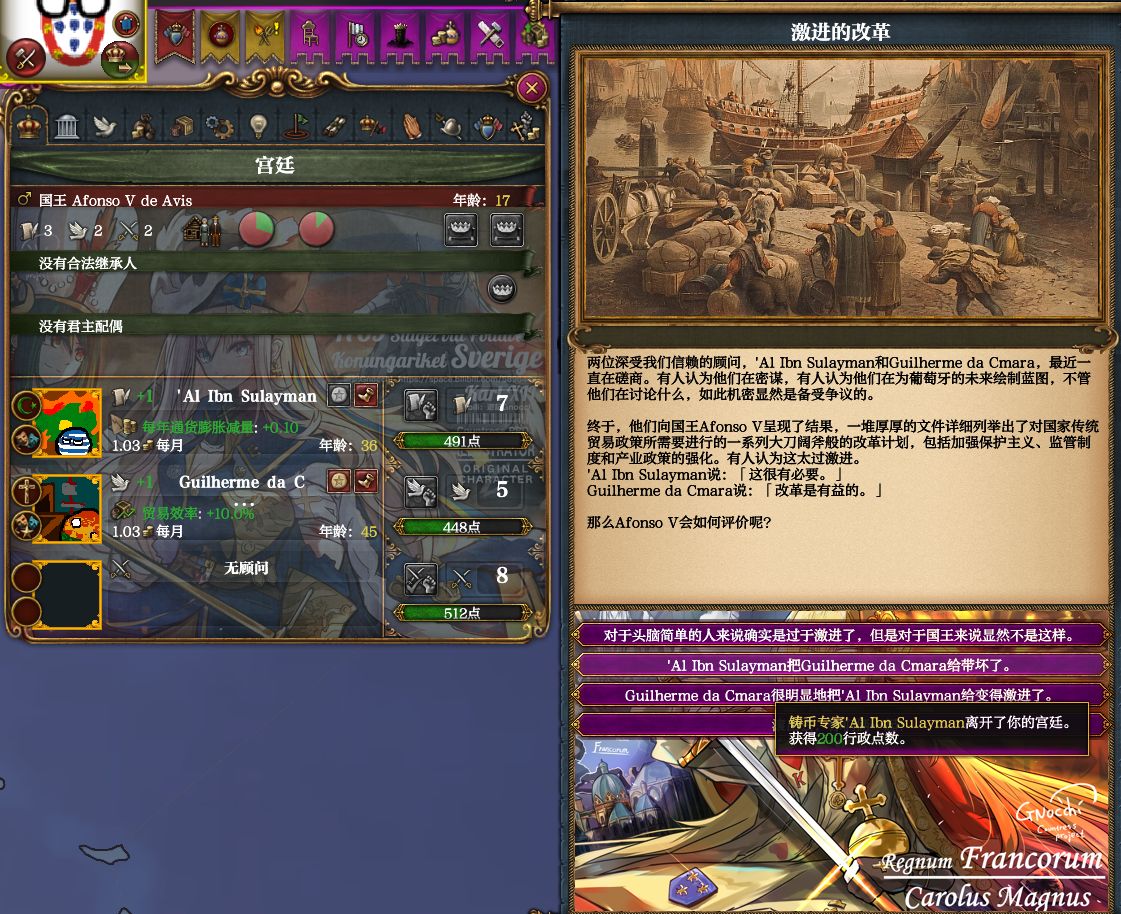 1450年觸發事件“激進的改革”,直接收400點數,美滋滋!這裏由於兩個顧問也不是什麼特價顧問,所以沒管直接被踢掉了。