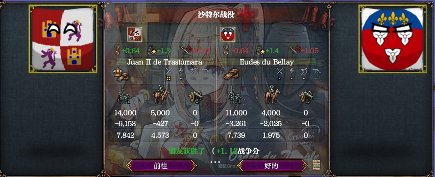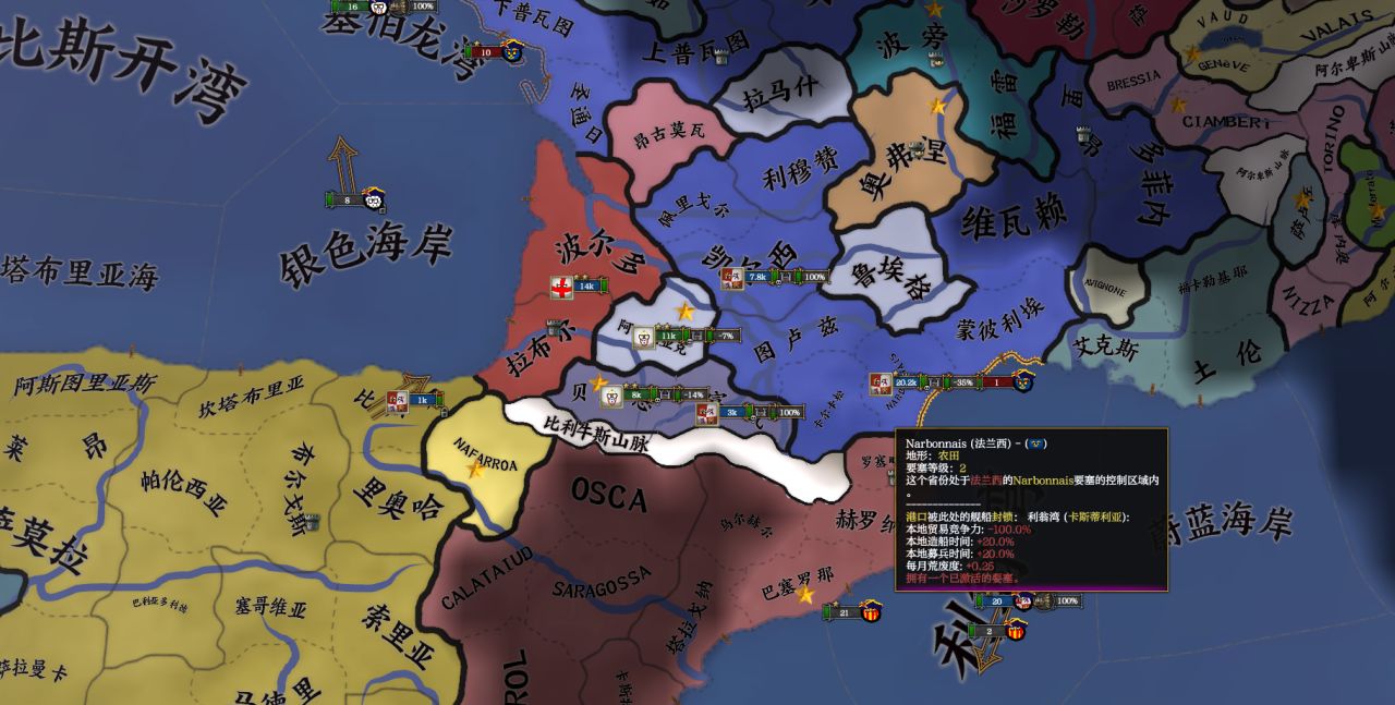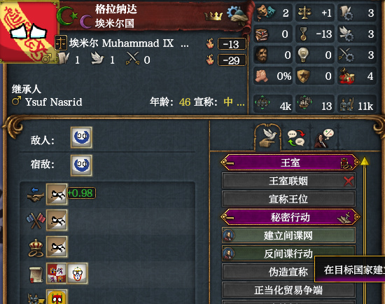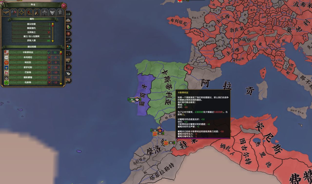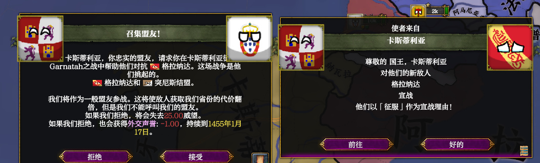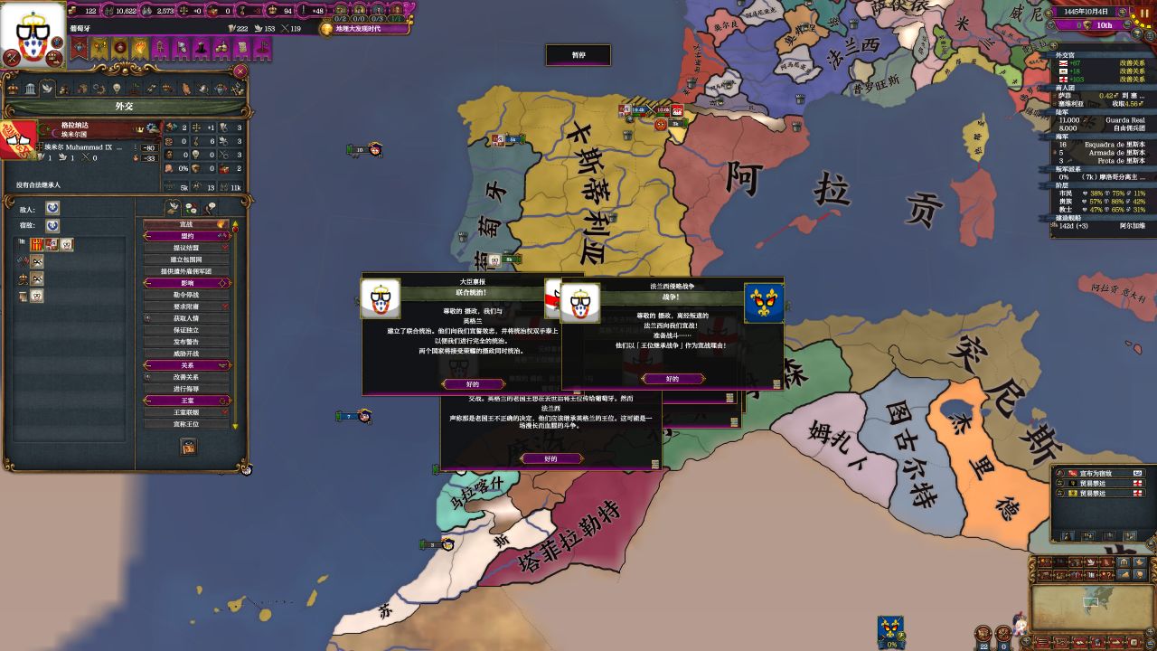 1450年2月,卡卡邀請我們打格林納達,我們這裏肯定要去啊,儘量佔領省份,卡住卡卡的變身地不讓他後續變身西班牙(由於前面掛格林納達的間諜網太晚,導致到這時宣稱還沒造好,不然應當主動拉上卡卡宣戰格林納達)。