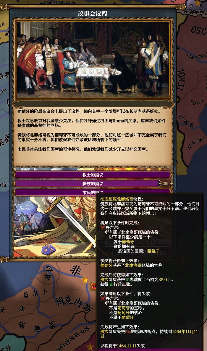 在1444年,我們的君主阿方索依舊未成年。王國的日常統治被委任給他另一位叔叔,科英布拉公爵唐·佩德羅(攝政)。唐·佩德羅的攝政充滿艱難,難以掌控宮廷內強力的葡萄牙貴族,但公爵目前至少能夠讓貴族們付出來巧妙地強化王室力量。隨着阿方索長大,宮廷內的其他勢力會嘗試控制他,以圖讓年輕的國王成爲他們的傀儡