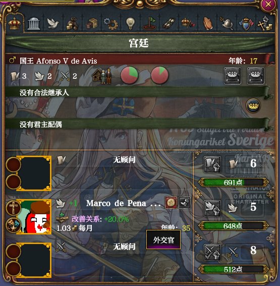 隨便找了一個外交顧問,改善關係還不錯拉拉英格蘭的關係(外交聲譽優先)。行政顧問留着,準備後續掛任務的半價3級顧問。