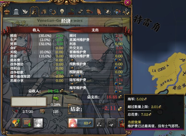 拉低陸軍維護費,並將本土兩個要塞關閉。同時將商船留下3艘(方便探圖),其他派去本埠節點保護貿易,派在突尼斯節點的商人派回本埠收錢,過月收入