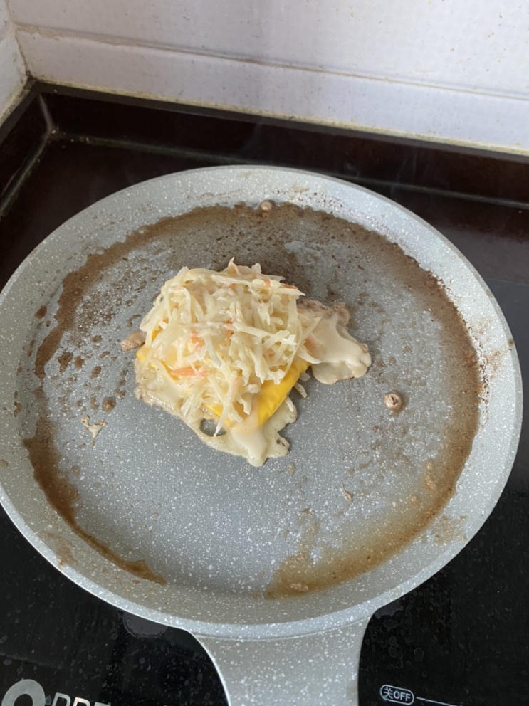 4.做法1-起锅刷油,放入第一层的土豆丝,盖上芝士片,再加一层土豆丝(推荐马苏里拉芝士,可以拉丝)