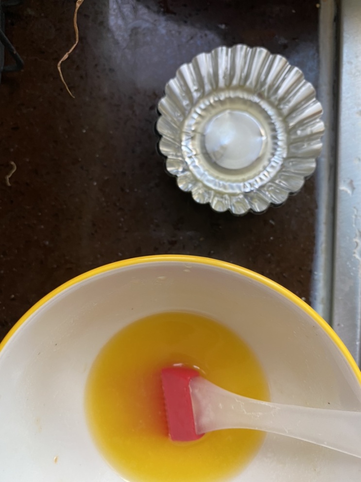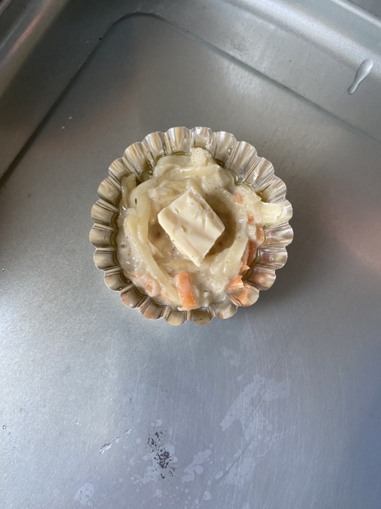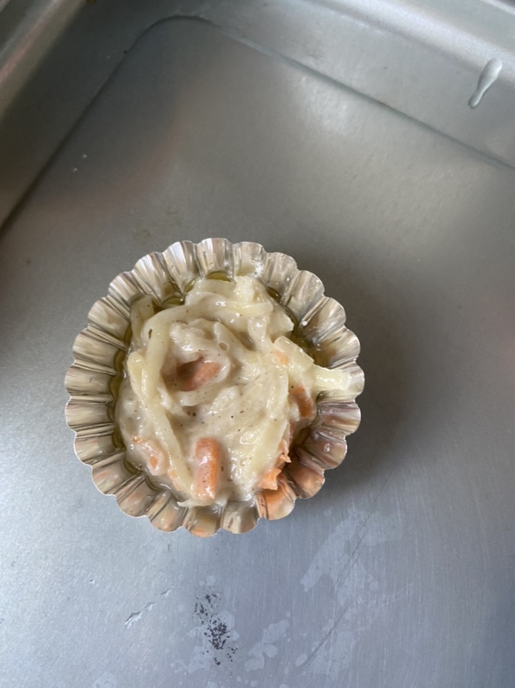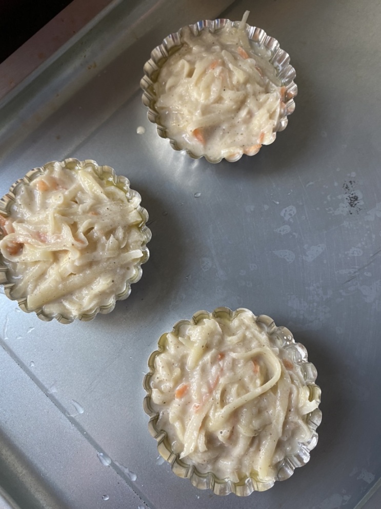 6.做法2-准备蛋挞锡纸壳,刷油,放入土豆丝,加入芝士,再加入土豆丝把芝士盖住