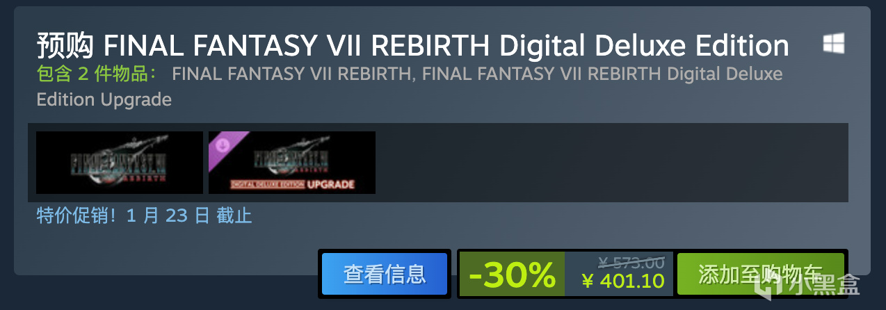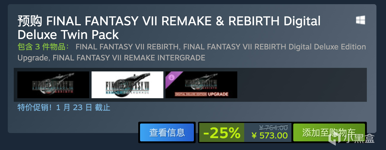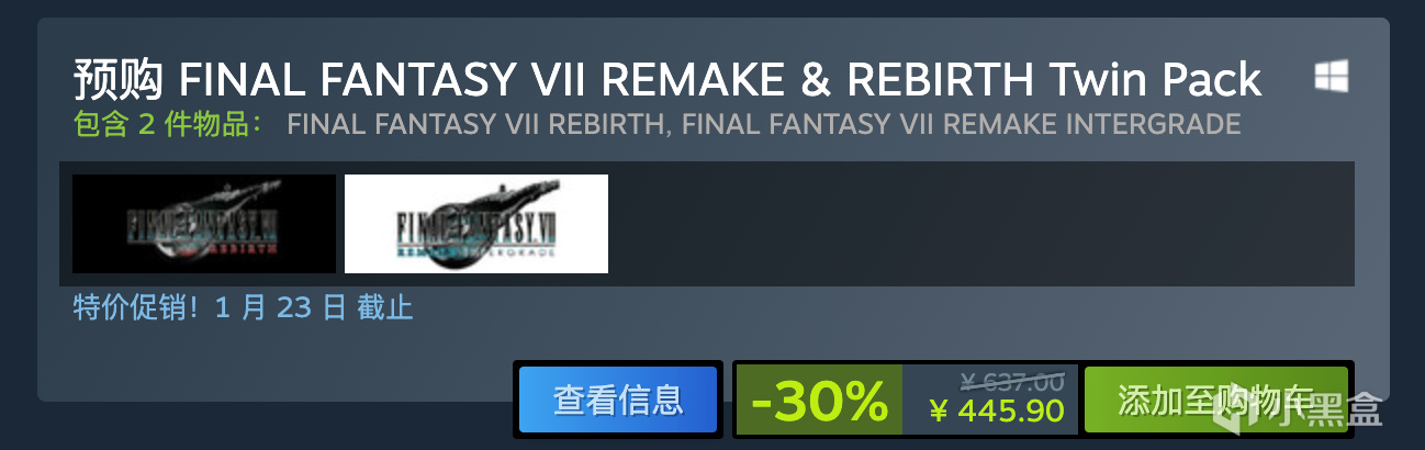 但在1月23日,索尼旗下獨佔1年的《最終幻想7:重生》也要叛逃投曹了,從PS平臺移植到PC平臺,這樣遊戲的畫質和分辨率可以隨着顯卡的提升進一步解放,同時遊戲的預售價這次也十分可觀,在1月23日前購買可享7折312元,並且原價446元的第一部《最終幻想7:重製》從446元腰斬到248元,預購第一部與第二部合集還能整體打7折,445元入手兩款3AJRPG(第一部非開放世界)。