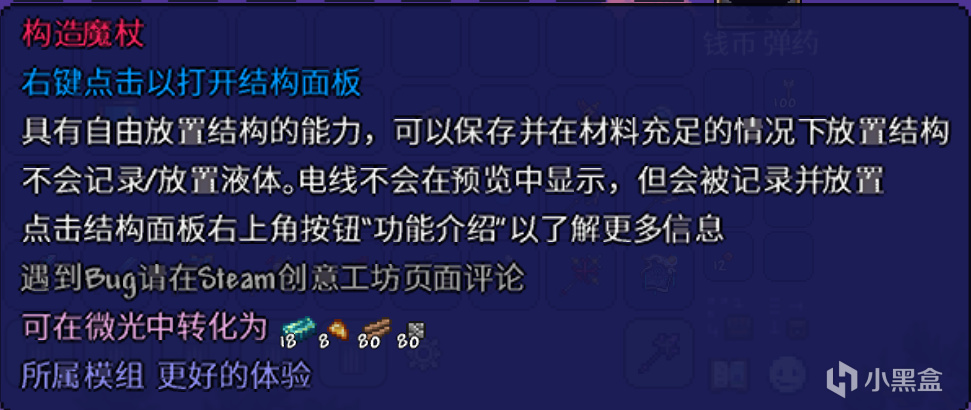 構造魔杖,一個肉後可以合成的法杖,但是似乎非常……非常多的人沒有聽說過他的存在,他的主要功能類似於我的世界中的結構方塊,可以存儲不同存檔的建造並在另一個存檔中建造他,不過因爲文章篇幅有限,這裏僅介紹他對於戰鬥場地的建造功能。