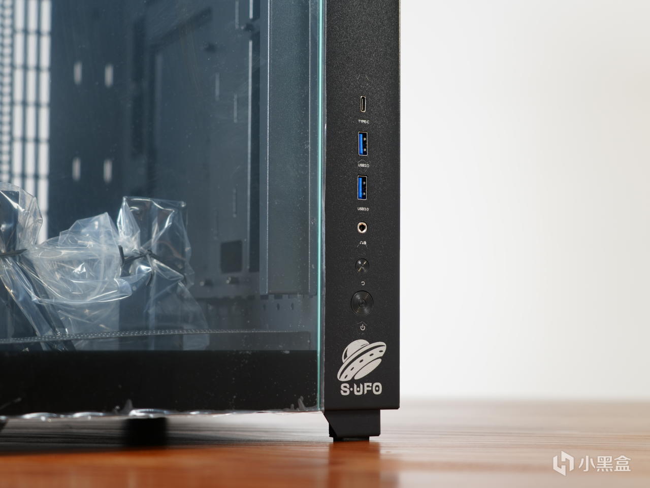简单过一下前面板接口,一个C口、两个USB 3.0、3.5mm耳麦一体接口,重启键、开机键,此外还有个UFO的小LOGO。