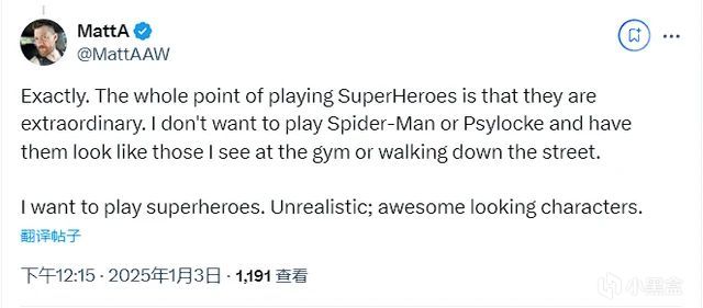 在相关的Twitter帖子及衍生社区中,对《漫威争锋》角色设计的支持与赞赏成为了主流声音。网友们纷纷表示:“确实如此。玩超级英雄游戏的全部精髓就在于体验那些非凡的存在。我并不想扮演一个普通得如同大街上随处可见的路人版蜘蛛侠,我渴望成为超级英雄本身。我想要扮演的是那些超越现实、看起来炫酷至极的角色。”这些言论无疑彰显了《漫威争锋》在角色设计上的独到之处,以及玩家们对此的高度认可。