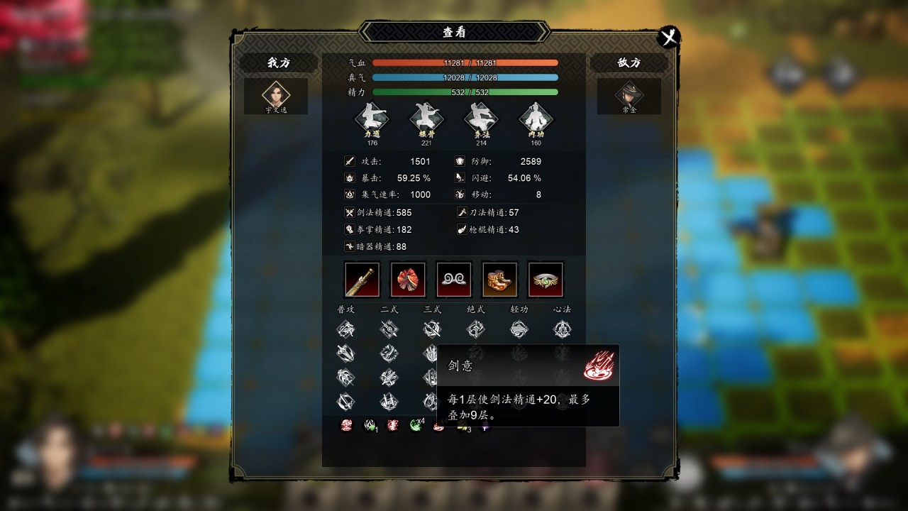 3、战斗中”ESC键“查看双方装备,功法以及角色目前的各类效果词条
