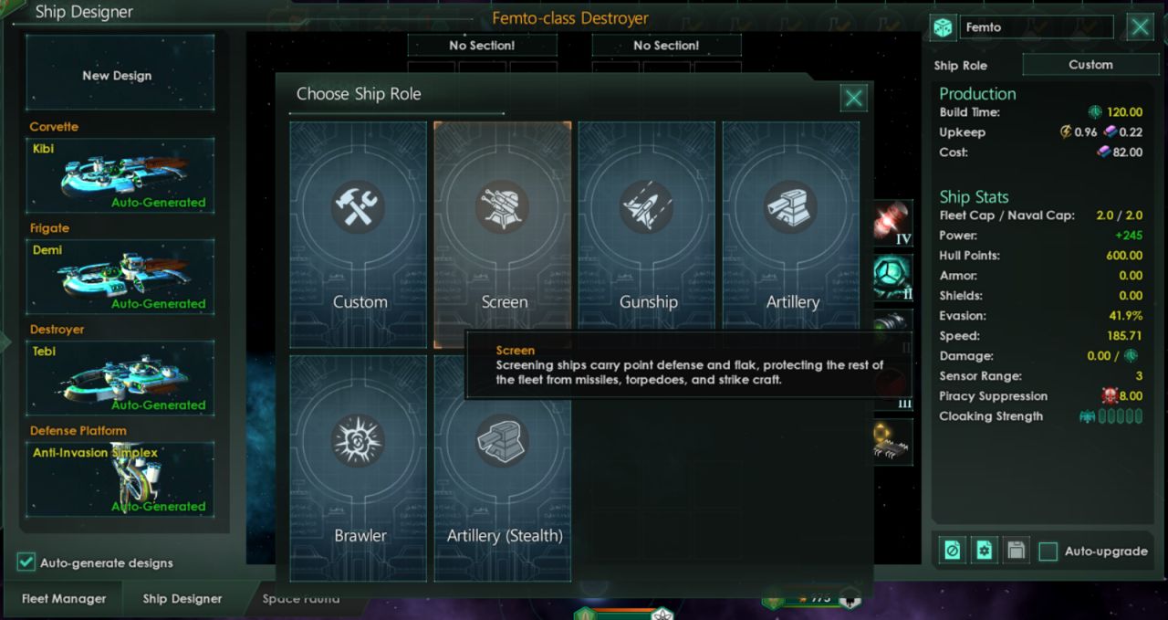 而且现在打勾“自动生成设计”也不会阻止你保存新的舰船设计了! 从左至右,从上至下 自定义 防空 炮舰 火炮支援 近战压制 火炮支援(注重隐形)
