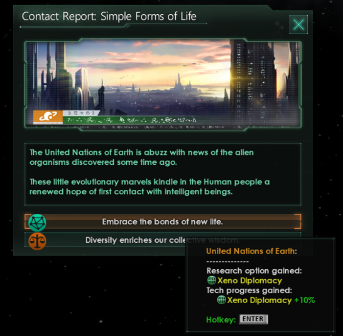 事件选项可以帮助引导你的帝国成长方向。 接触报告:简单生命 地球联合国新闻满天飞,内容都是关于不久前发现的外星生物。 这一生命的奇迹再次使人类对第一次接触其他智慧生物满怀期待。 选项1:让我们拥抱新生命带来的纽带。 选项2:多样性能让我们的共同智慧更加丰盈。 地球联合国: • 获得研究选项:异种外交 • 获得科技进度:异种外交+10% 快捷键:Enter 异常在探索阶段本是个很棒的内容载体,但每当科学舰发现新情况时就整一个弹窗,实在让人头疼。现在我们会把这个弹窗改成一个Toast。你既可以点这个Toast或右下角通知来打开完整的异常界面,也可以直接从情报日志查看。