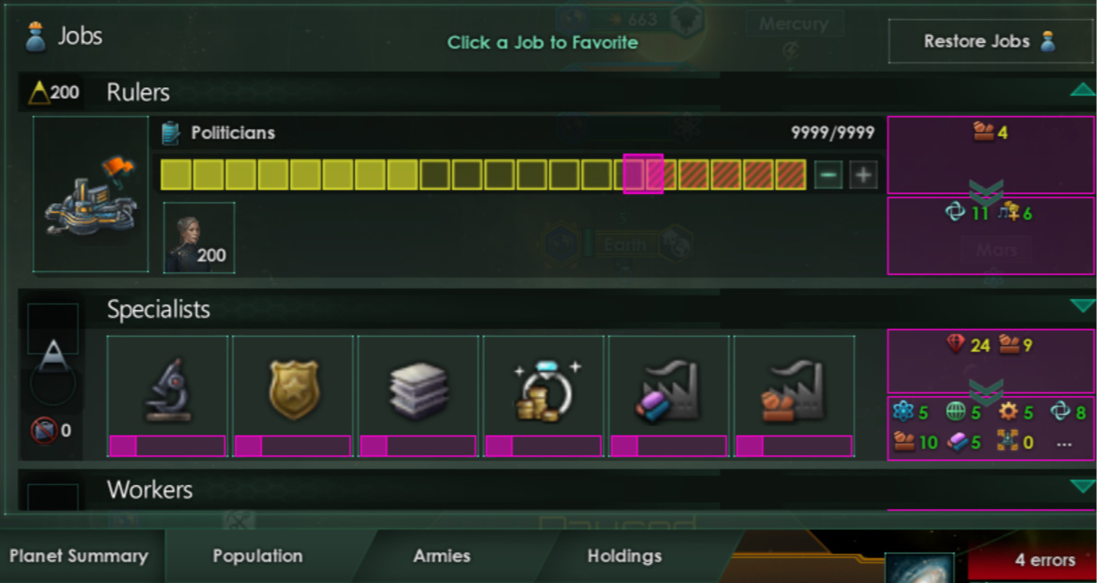 我们的初步实验相当有前景,所以在4.0“凤凰”更新中,我们会彻底改变人口的基本工作方式:我们会根据种族、阶层和伦理观,将人口分成若干人口组,并让这些人口组一同提供一个“劳动力总量”,这个劳动力将被用于填充(或者部分填充)岗位。同时,我们也会调整“人口”的总体规模——先前影响到或会操作“1人口”的任何事情,现在都会对应影响“100人口”。 这些改动将大大影响诸如人口增长、迁移以及很多其他系统。我会在之后专门写一篇开发日志,详细介绍这些改动在正式开放测试(Open Beta)之前的更多细节。 贸易 现有的贸易系统会不停地计算贸易线路路径以及海盗生成,这对性能的损耗与它带来的收益相比明显不成比例。我们打算对它进行大幅简化,把贸易改为标准资源,并用它来表示总体物流能力。因此,可能会让格式塔也能使用这项资源来表示他们的物流。同样的,我们将在未来的开发日志里进一步解释这块改动。