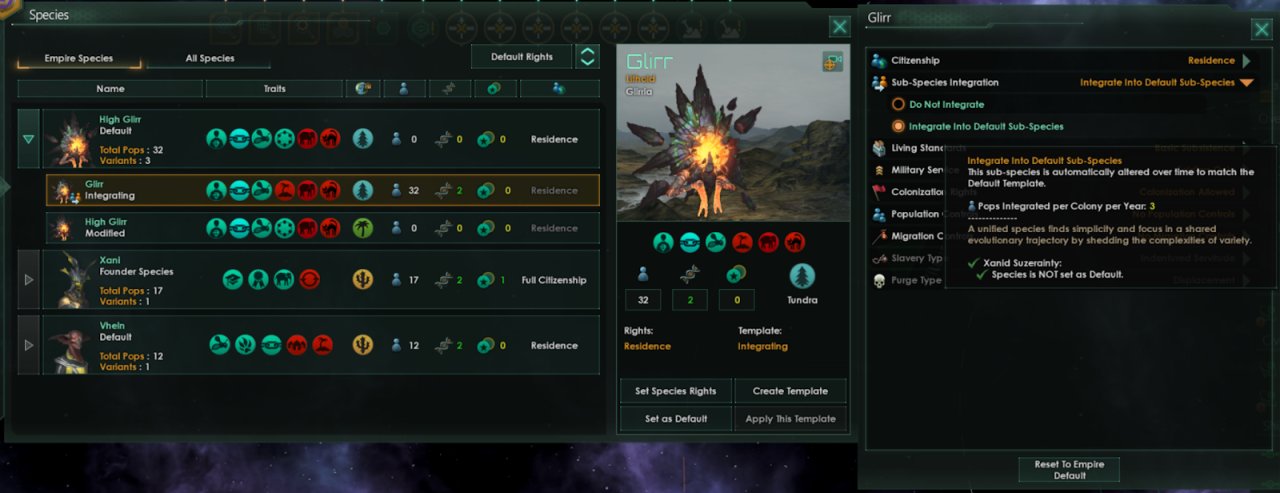 其实上面提到的很多改动都属于整体游戏体验的改进。这里我想额外提两点:物种改造流程与殖民流程的优化。 殖民流程 之前在殖民行星时会出现一些“怪癖”,尤其是在你使用“星球自动化”功能的时候。我们会把“殖民地”这个星球种类转变为一个会在开拓初期持续存在一段时间的修正,并允许你在发起殖民命令时就可以指定未来的星球“角色”,甚至是开启自动化。这样,你在游戏中、尤其是中后期,就不用纠结“是不是先要让它保持‘殖民地’角色才能享受其舒适度与稳定度加成,但这又跟自动化冲突”这种烦恼了。 新的流程还能让自动化功能正常工作:你不至于碰到“当‘殖民’角色无法再使用时,自动化只好转成随机其他角色”的尴尬。 物种改造与同化目标 我们对基因改造的流程做了统一梳理,以去除很多不便之处,让它总体上更流畅。现在你也可以设置一个模板作为物种默认模板,并可让变种分支根据需要自动整合到默认模板里。