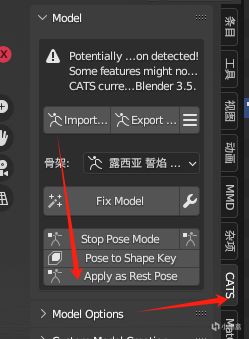 接着選擇CATS插件,按Apply as Rest Pose,這樣一來我們的T-pose就是默認的動作了,做其他的修改就不會回到原來的姿勢,順便再次ctrl+A應用一下全部變換;
