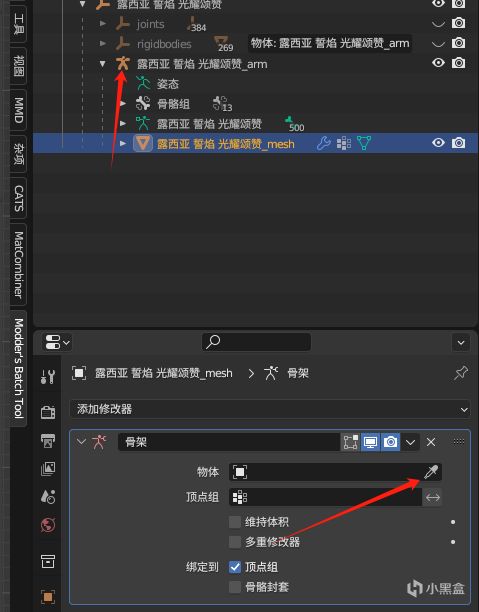 選中骨架-進入姿態模式-選中肱骨,按r後移動鼠標,看看模型有沒有跟着旋轉,如果跟着轉就是對的,如果沒有跟着轉,請先切換到物體模式,選擇模型,點右邊的小扳手,點添加修改器;