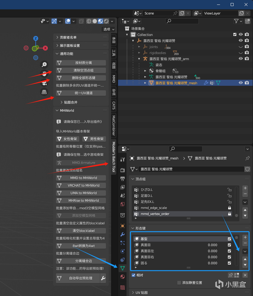 正式進入操作,選中模型(注意是模型!不是骨架!),選中Modder's Batch Tool(後文簡稱MBT):清除空頂點組、刪除全部形態鍵、統一UV通道,暫時不要【按材質分離】