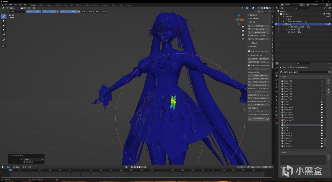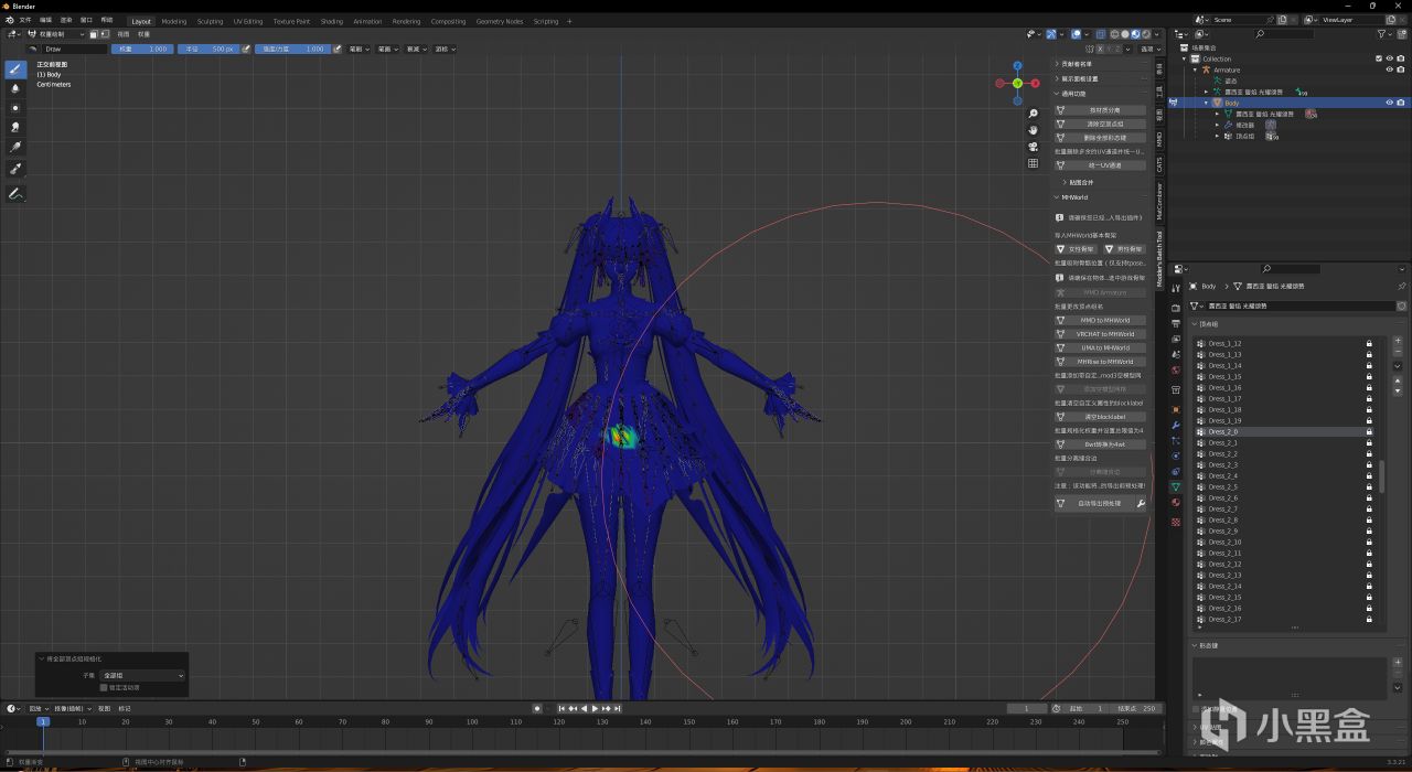 現在要做的就很明確了,選中所有有物理的部件的權重(包括絲帶/裙襬/頭髮等等)融進父結構!