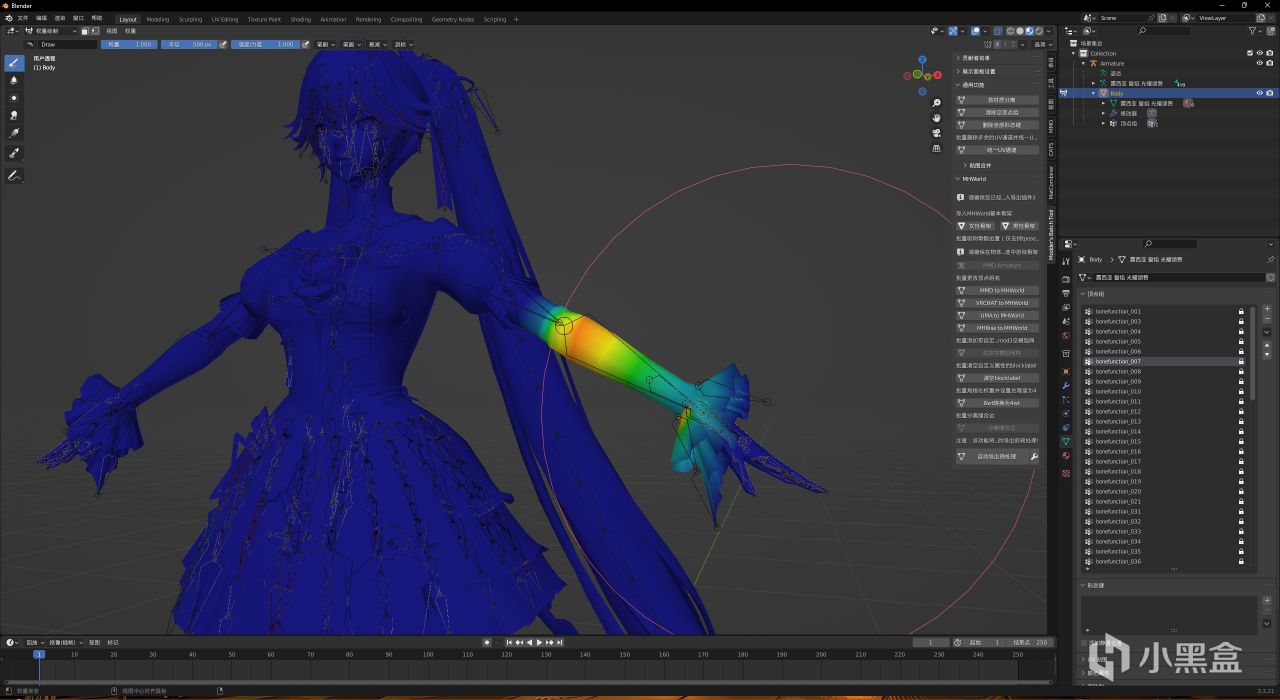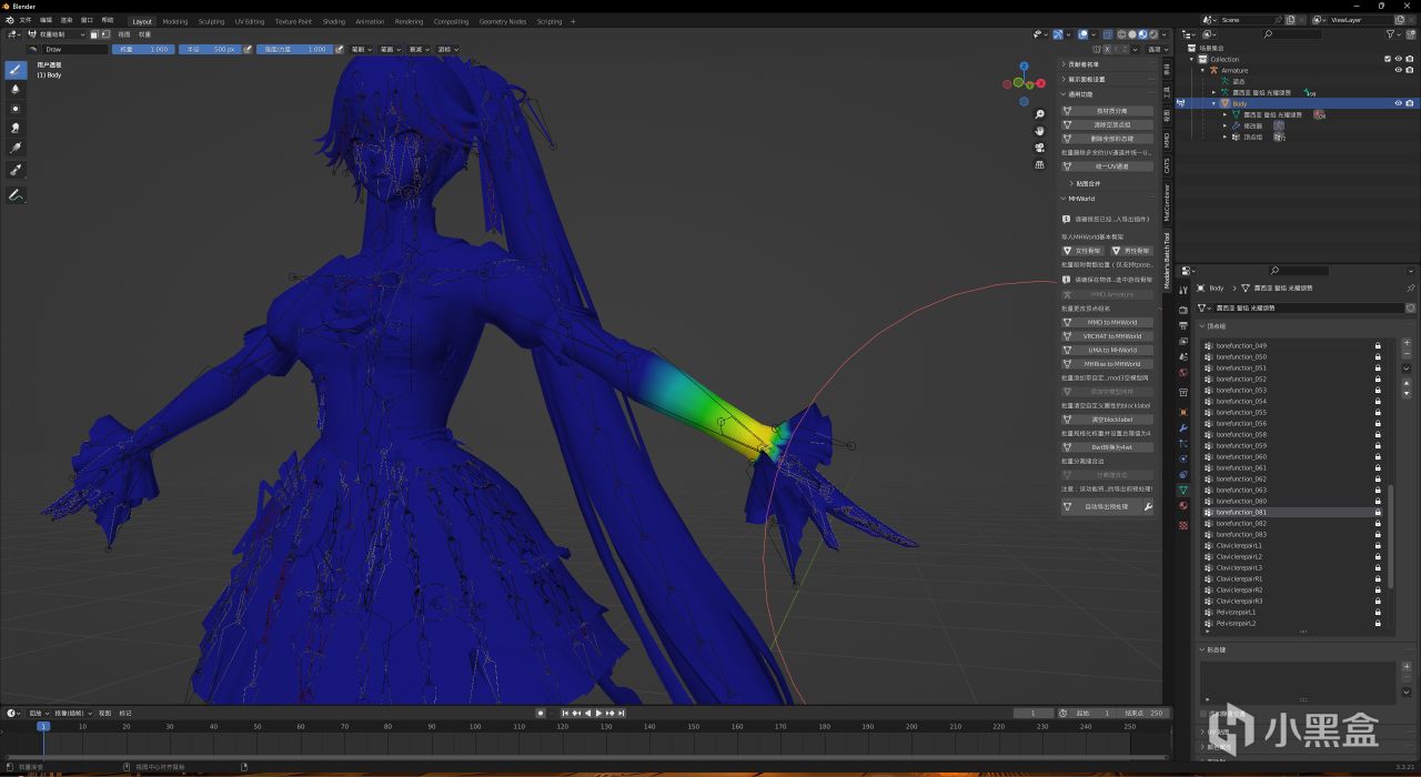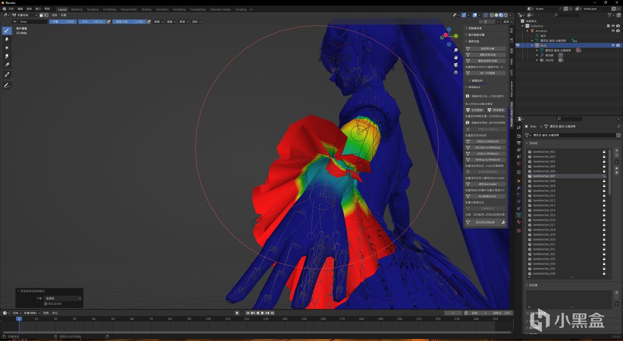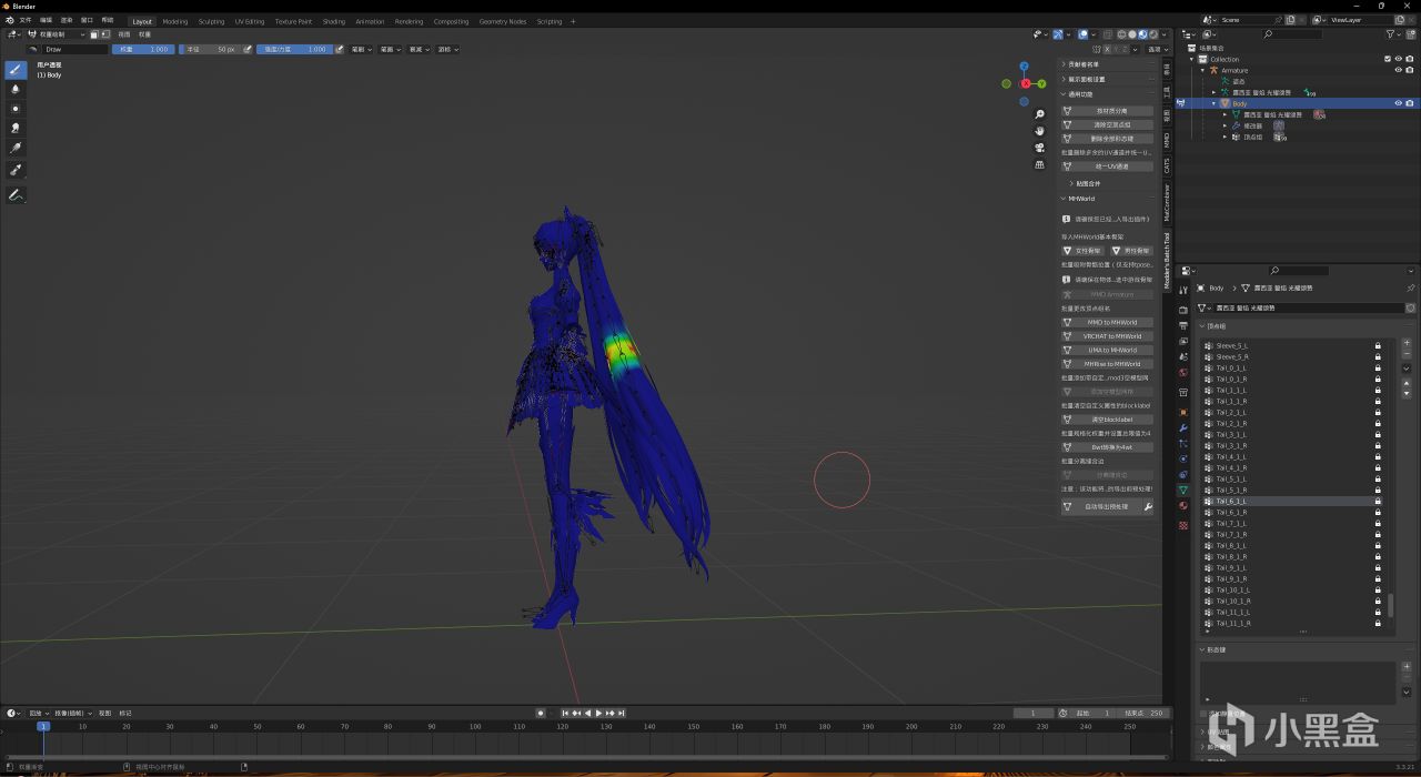 如果你還是不能動,進入物體模式,選中模型,進入權重繪製模式,隨便選幾個頂點組,看一看是不是像我這樣一部分亮的,如果每一個頂點組都是全藍的那麼估計是你在8轉4的時候沒有刪掉多的兩個“mmd“開頭的頂點組(具體原因是爲了控制4wt的上限,刪除了多出來的權重);