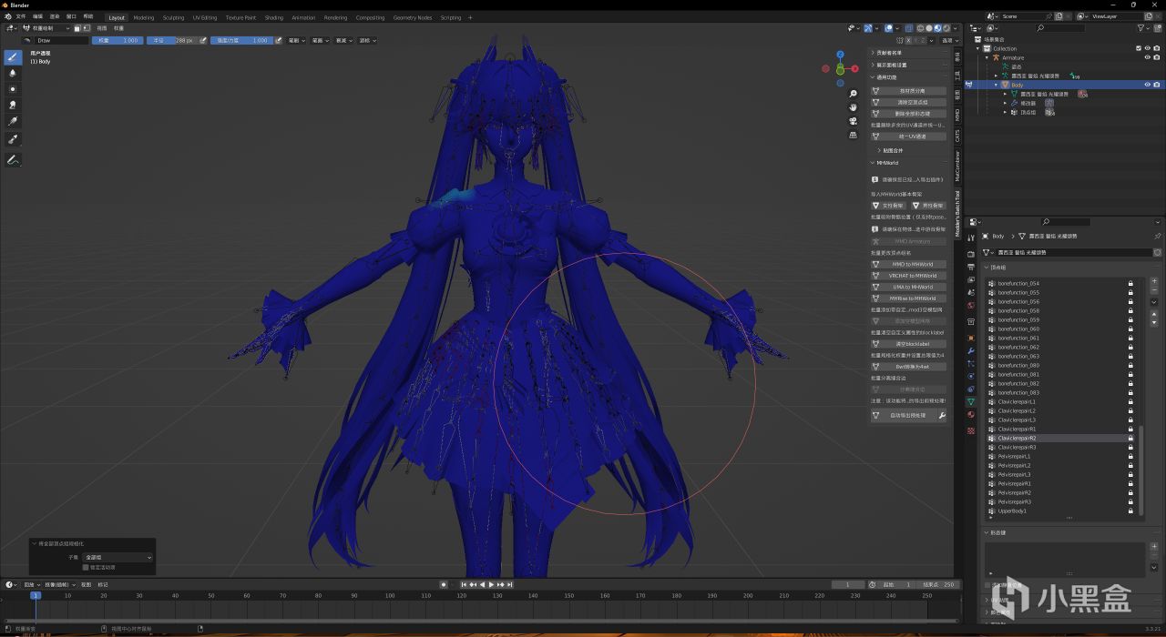 我們看得出來,這個模型有很多骨骼,其中絕大多數是頭髮、裙子這些具有物理特性的,非剛體的結構(說人話就是會隨着風和移動飄起來),由於我們這一期是入門的製作,就不涉及物理(之後會講的,所以讓你們先保存了副本)(當然最終產品也是鋼板頭髮)。