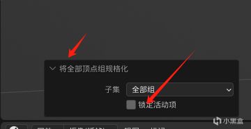 然後選擇權重、按下【全部規格化】、點開左下角的箭頭、關閉【鎖定活動組】、選擇all groups(全部組)