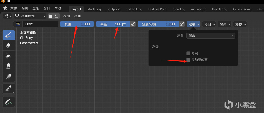 把權重、筆刷半徑、強度全部拉滿,關掉【僅前面的面】選項