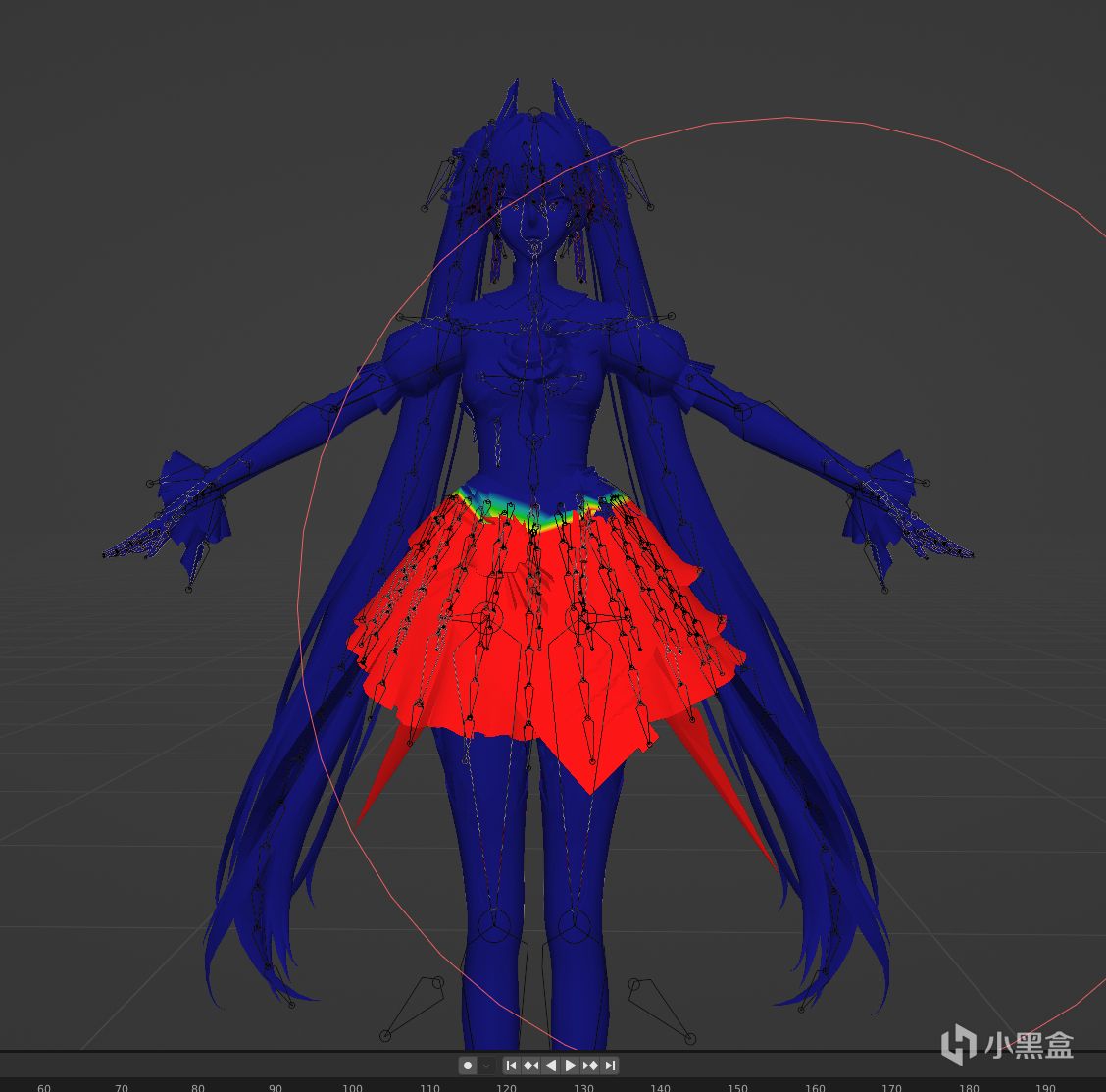 會發現這是腰部的權重,我們現在一樣,解鎖013,把裙子部位全部塗紅