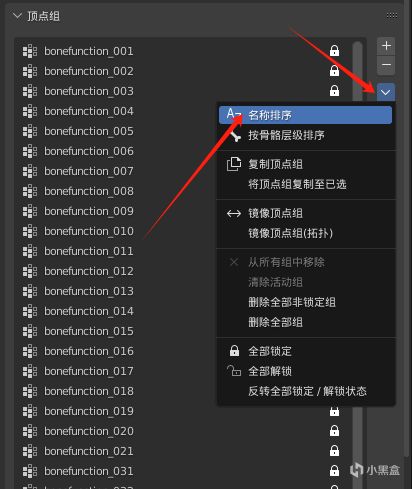 點擊下箭頭,點擊名稱排序,讓世界頂點組正序排列