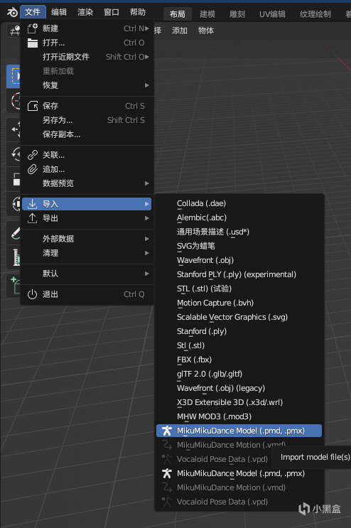 一切就緒之後打開blender,按下A全選、按下X刪除所有的部件,點擊文件-導入pmd文件