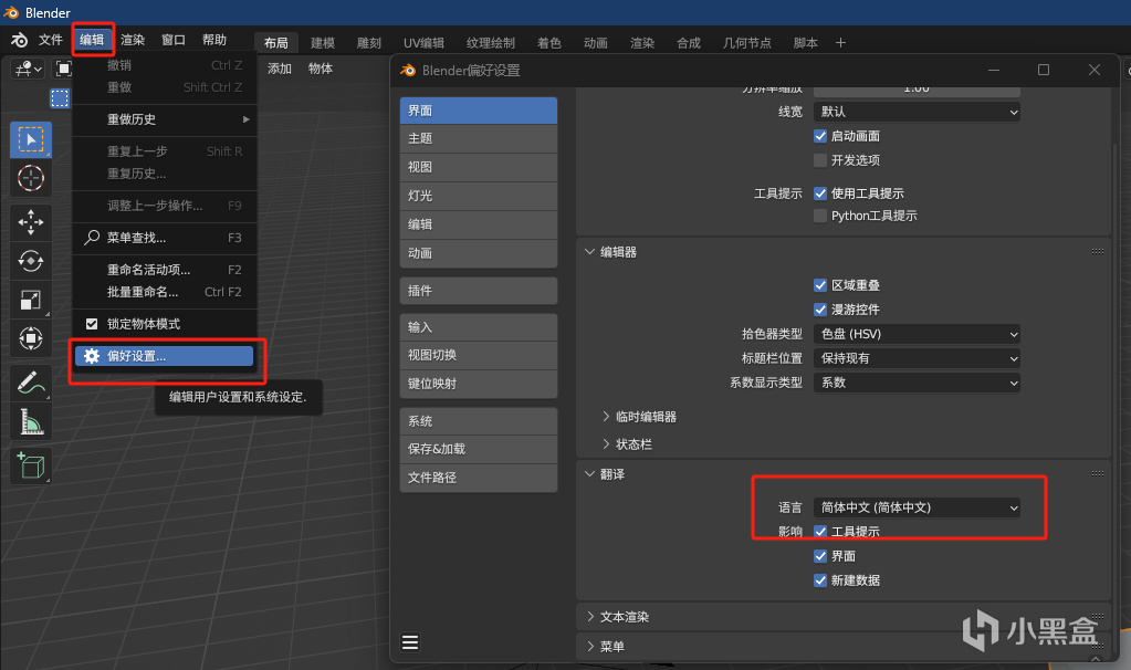 進入blender後可能是英文界面,可以這麼調整爲中文;