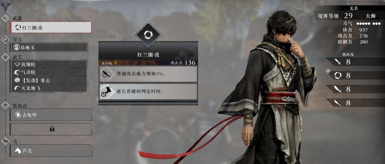 不坏一刀(3气):没蓄满:104,1甲,蓄满:324,2.8甲(神技,只消耗3气却能打出5气的伤害,实战中挨打两下就能蓄满,需要注意的是只能挡白光攻击)