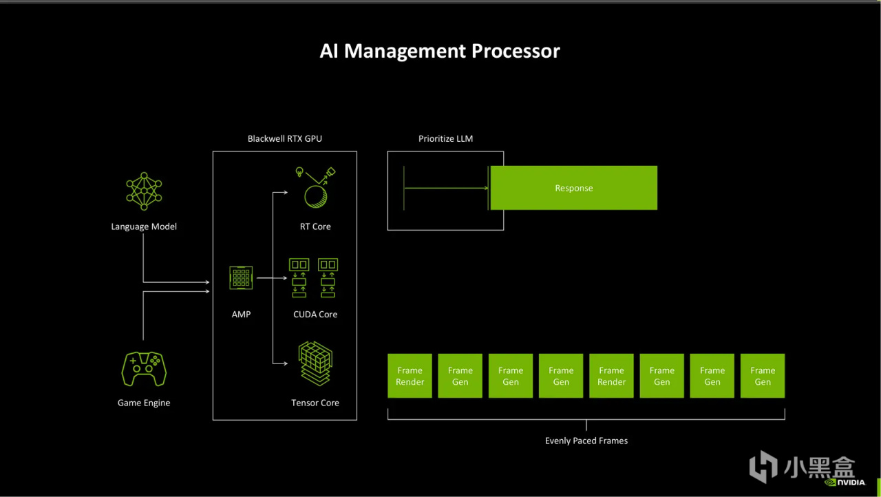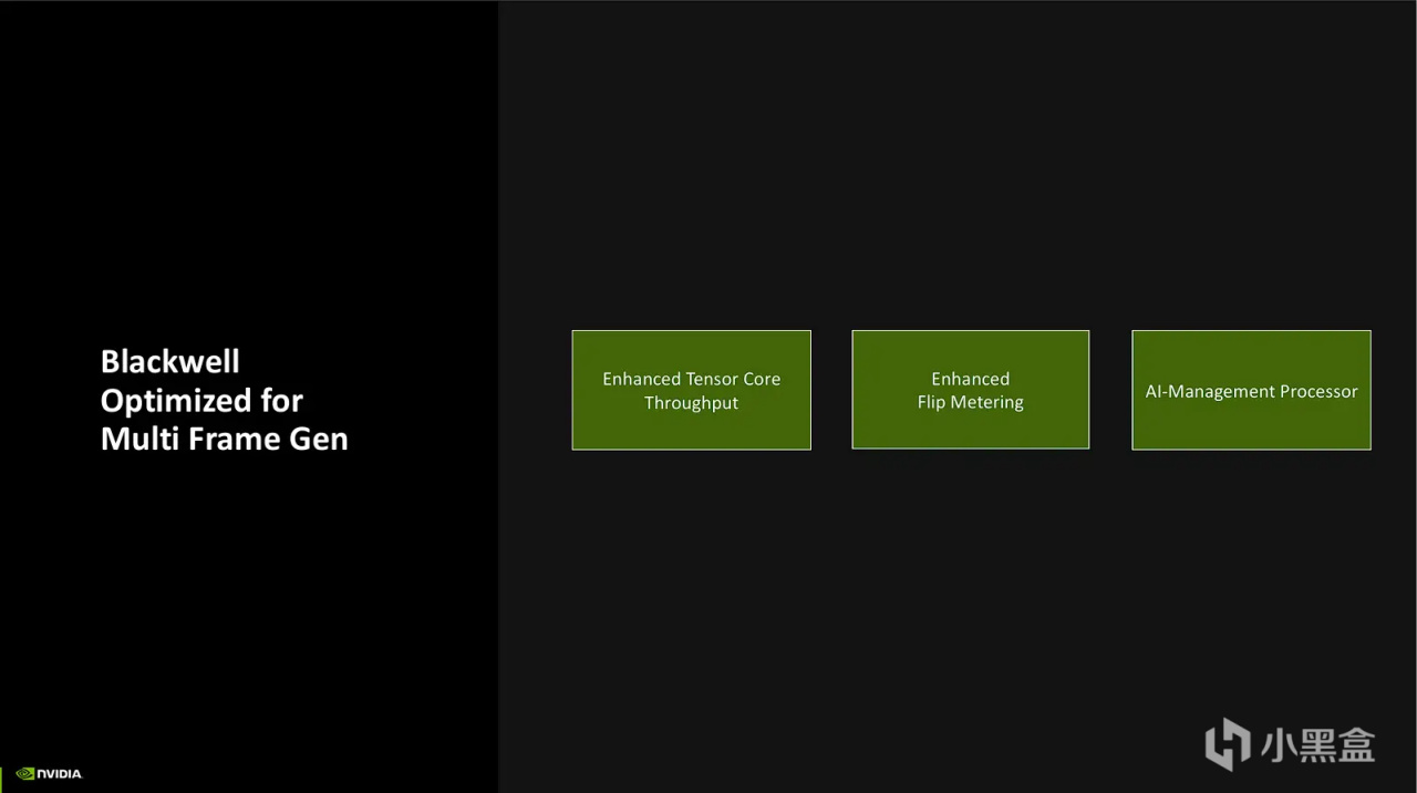 为了除了非常复杂的多帧生成过程,Blackwell架构的GPU采用了全新的硬件AI Management Processor,它可以将帧同步的逻辑转移到显示引擎上,能使GPU更加精确的管理现实的时序。