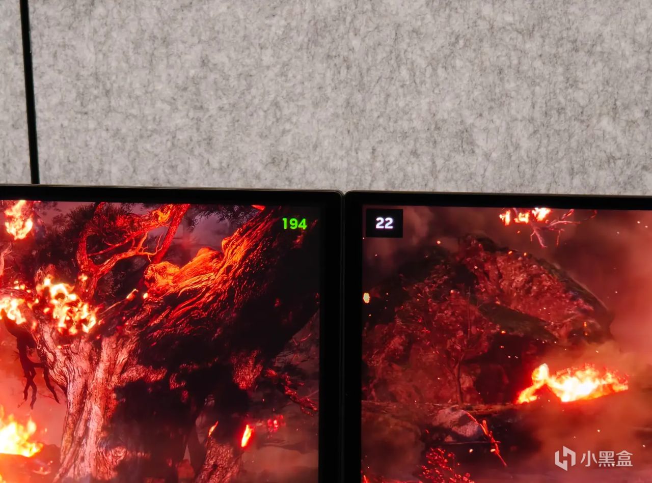 让我们来揭晓答案吧,右侧为未开启DLSS时的原生分辨率,此时游戏帧率为22 FPS,大家几乎可以体验到电影般的游戏帧率,而左侧开启DLSS后,游戏帧率飙升至194 FPS,游戏非常的丝滑流畅,也给足了我们升级4K 240Hz高端游戏显示器的理由。