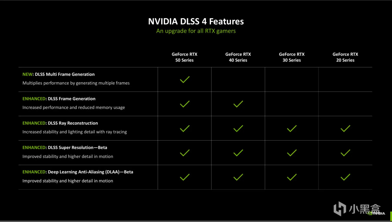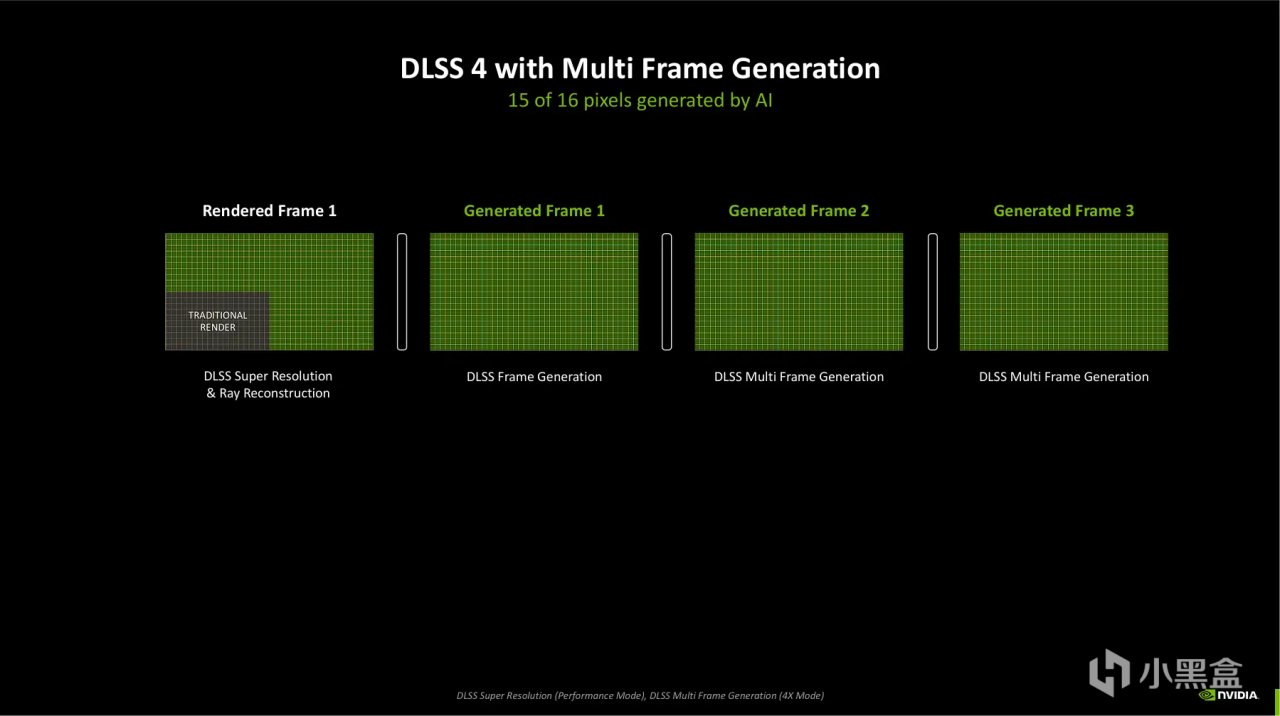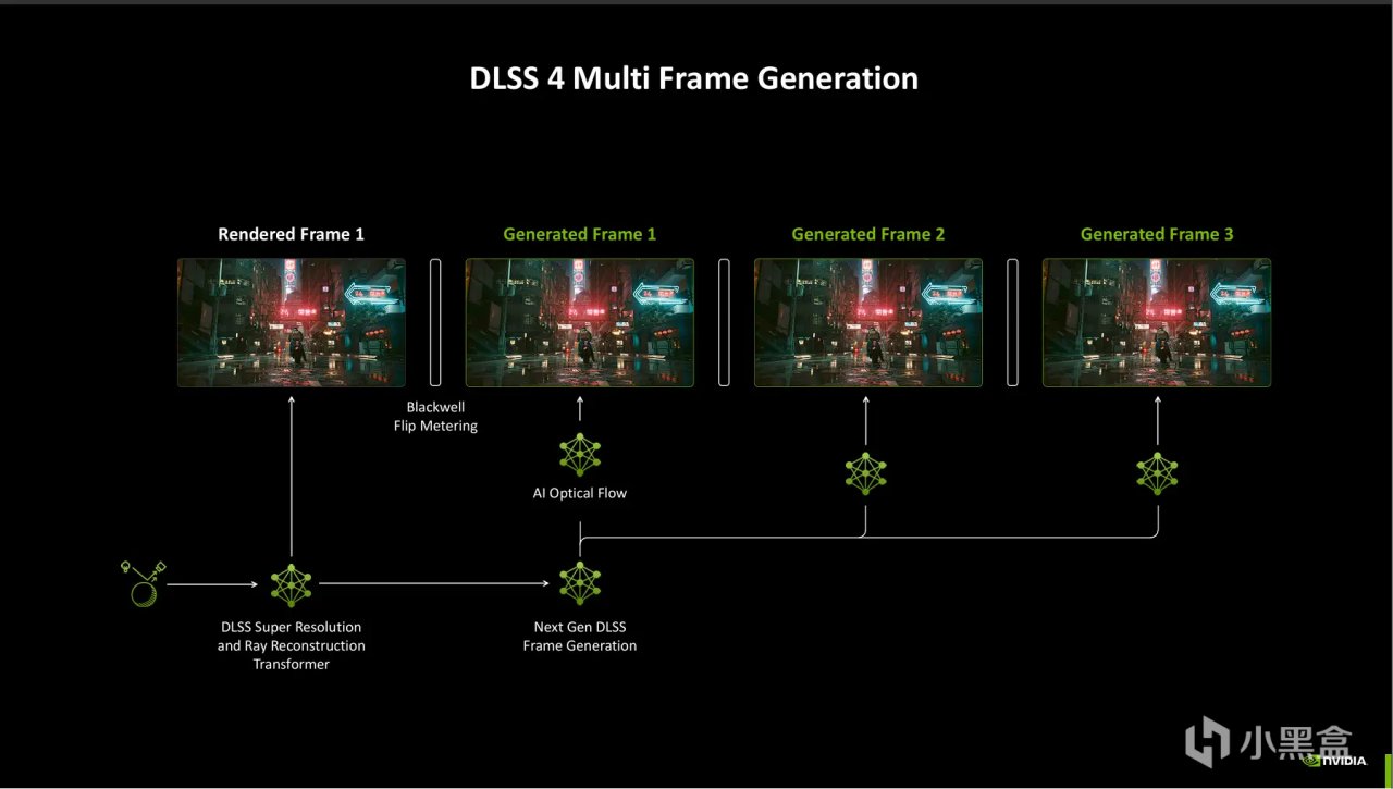 DLSS 4多帧生成技术严重依赖Blackwell架构CPU中的张量运算核心等专有部分,所以其目前为RTX50系独占。DLSS Mutil Frame Generation 潜在多帧生成技术与DLSS Ray Reconstrucion 光线重构技术、DLSS Super Resolution 超分辨率技术与Deep Learning Anti-Aliasing 深度学习抗锯齿技术共同构建了DLSS 4。