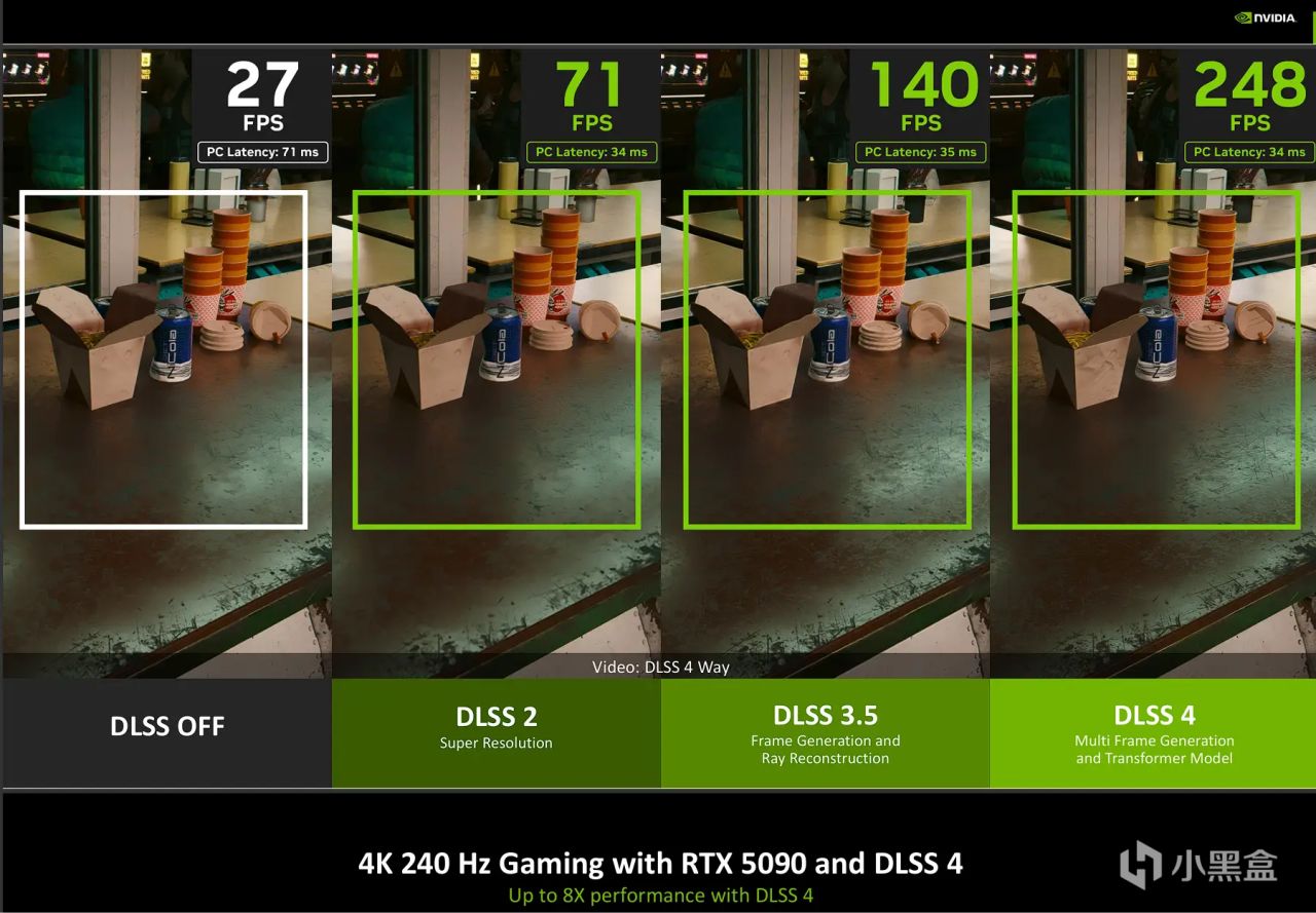 我们来看NVIDIA官方给的RTX 5090在不同版本DLSS下的游戏帧率表现,在4K分辨率下,未开启DLSS时,游戏帧率为27 FPS,PC延迟为71ms,而在开启DLSS 2、DLSS 3.5、DLSS 4后,游戏帧率分别为71 FPS、140 FPS、248 FPS,且延迟均为34 ms左右。