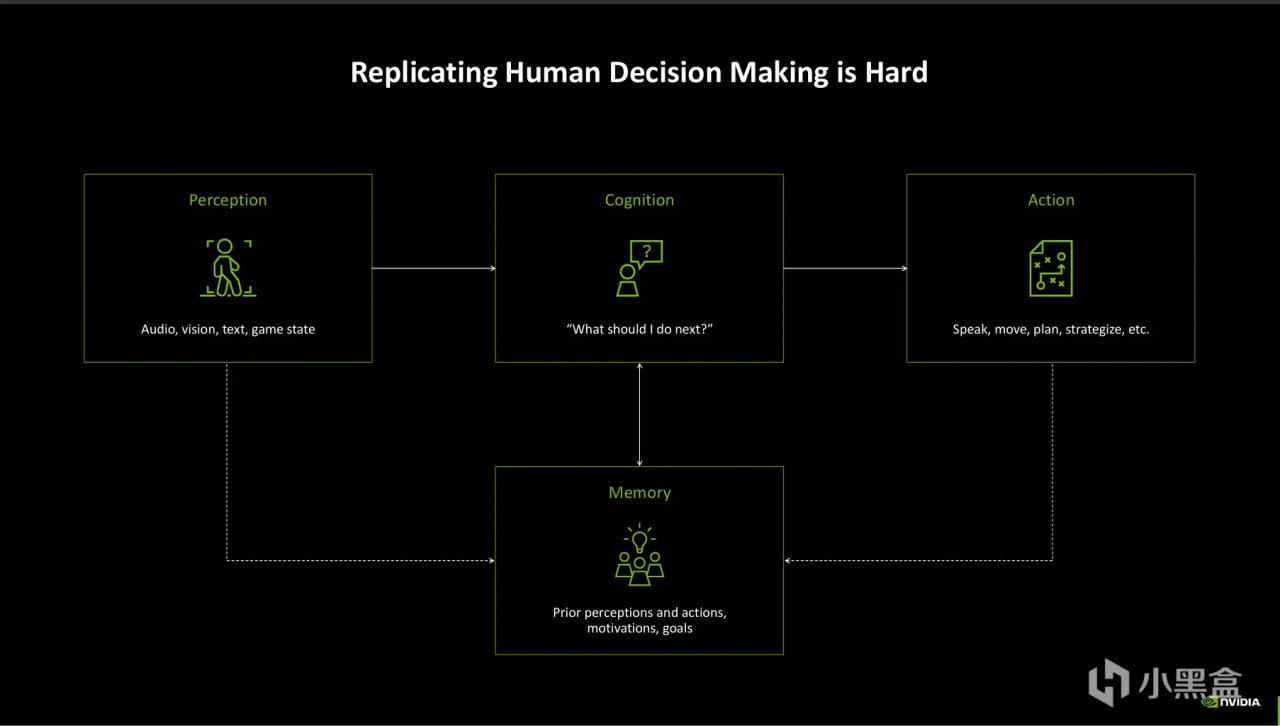 ▲说到让NPC像真人并不容易,首先他要能从游戏以及玩家的语音、视频、文字以及游戏状态等接收到有用的信息,并且对信息有着正确的认知并作出诸如对话、移动、交流计划等诸多回应,同时其还要有记忆功能,自己之前做了什么,做这些的目的又是什么,只有这样,NPC才能够“活过来”。