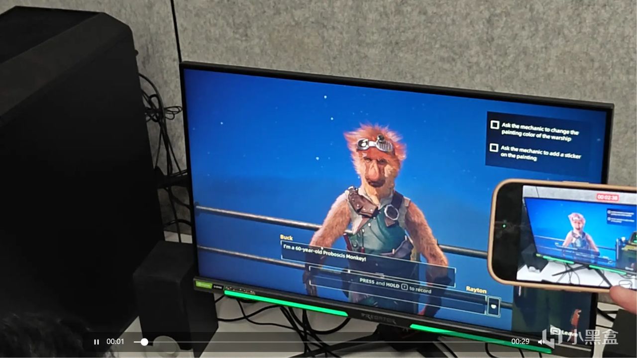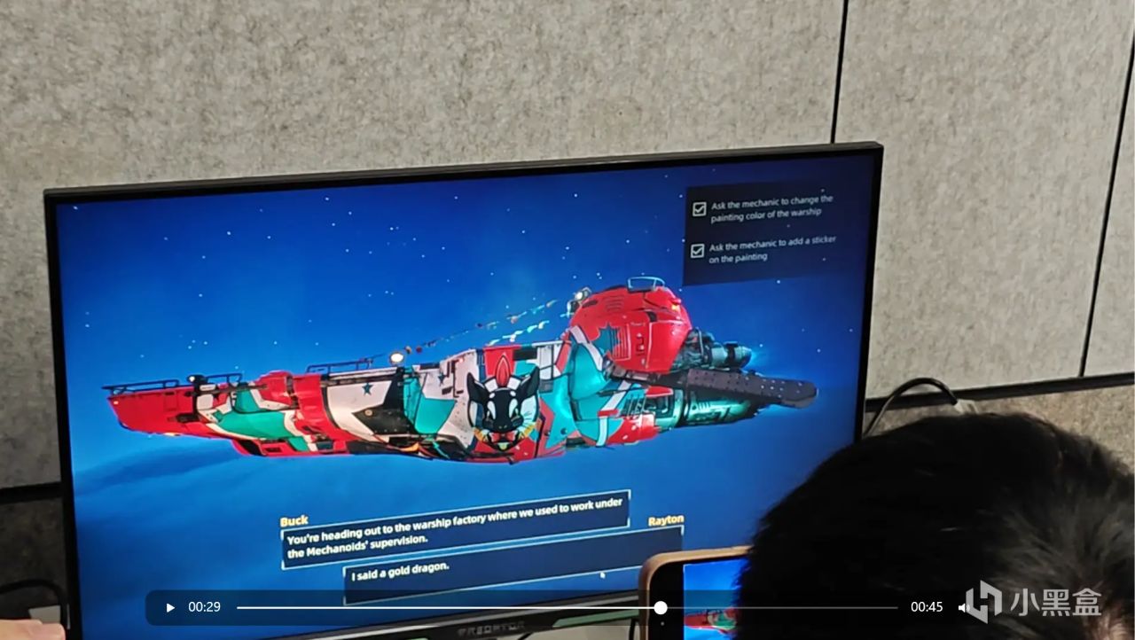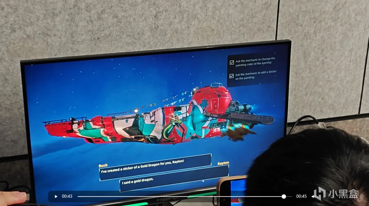 这是我自己在现场录制视频的截图,在视频29秒时,玩家通过语音提出了自己的设计方案,包含喷涂动画在内,在视频的第43秒时,飞船的涂装便已经重新喷涂完毕了,整个游玩体验还是十分流畅的。