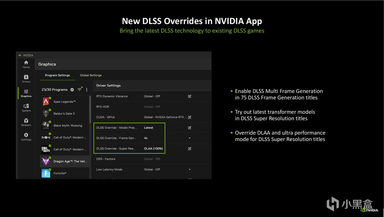 当然,对于将DLSS 4的开关集成到游戏的UI中并正确运行还是需要一定时间打磨的,所以NVIDIA直接在其新版的驱动管理软件NVIDIA App中增加了DLSS Overrides开关,玩家可以直接在此软件中开启DLSS 4并调整其各项参数。